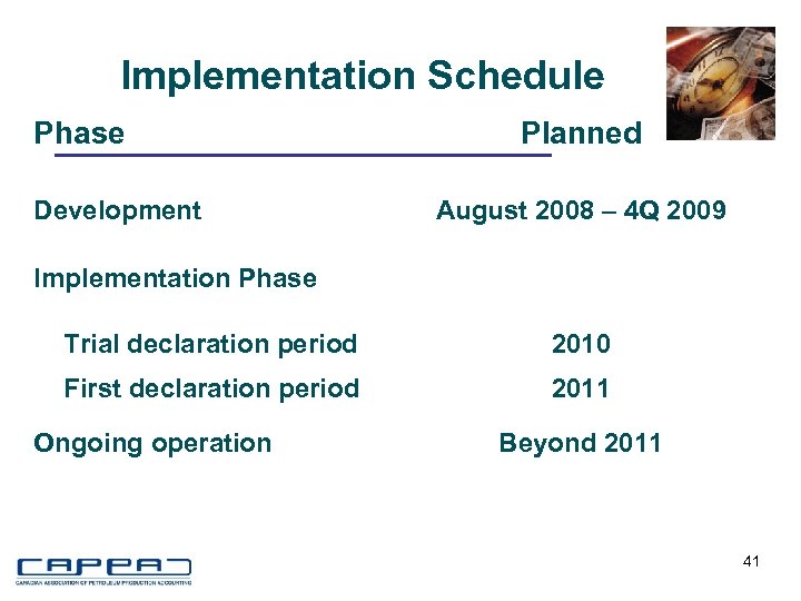 Implementation Schedule Phase Development Planned August 2008 – 4 Q 2009 Implementation Phase Trial declaration period 2010 First declaration period 2011 Ongoing operation Beyond 2011 41