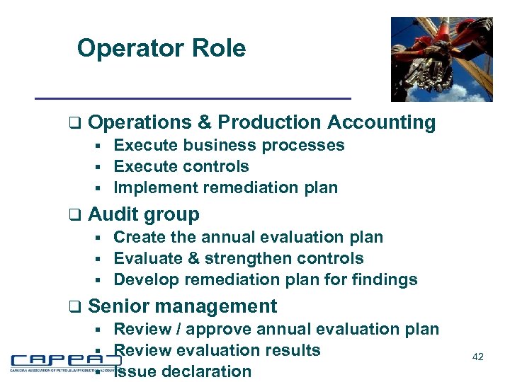 Operator Role q Operations & Production Accounting Execute business processes § Execute controls § Implement remediation plan § q Audit group Create the annual evaluation plan § Evaluate & strengthen controls § Develop remediation plan for findings § q Senior management Review / approve annual evaluation plan § Review evaluation results § Issue declaration § 42
