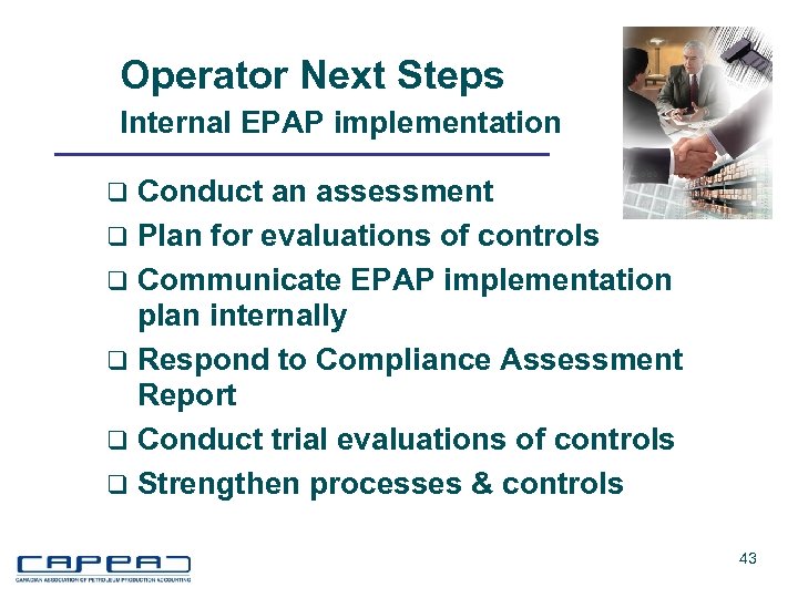Operator Next Steps Internal EPAP implementation Conduct an assessment q Plan for evaluations of controls q Communicate EPAP implementation plan internally q Respond to Compliance Assessment Report q Conduct trial evaluations of controls q Strengthen processes & controls q 43