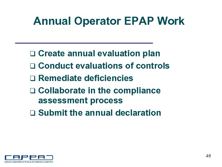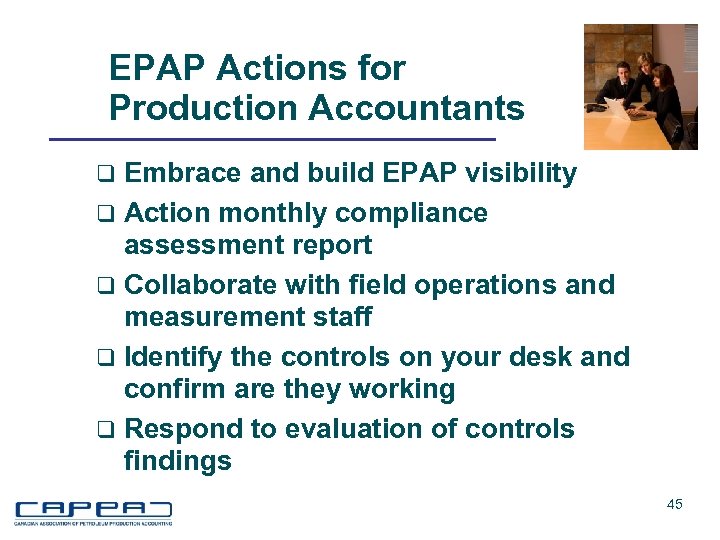 EPAP Actions for Production Accountants Embrace and build EPAP visibility q Action monthly compliance assessment report q Collaborate with field operations and measurement staff q Identify the controls on your desk and confirm are they working q Respond to evaluation of controls findings q 45