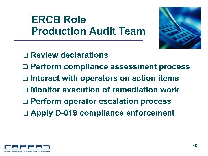 ERCB Role Production Audit Team Review declarations q Perform compliance assessment process q Interact with operators on action items q Monitor execution of remediation work q Perform operator escalation process q Apply D-019 compliance enforcement q 49