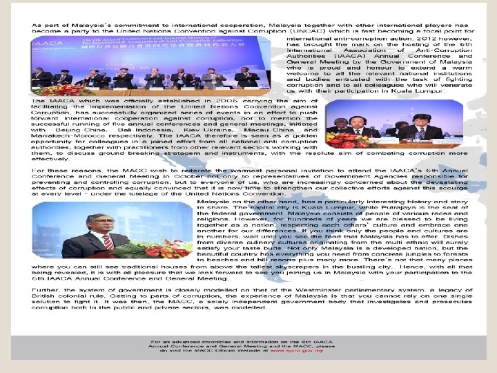 Joint Investigation: MACC and Australian Federal Police • L Polymer Note Printing Contract involving Malaysian Central Bank and Note Printing Australia ( A subsidiary of Australian Reserve Bank) in 2009 • In 2010 MACC has initiated a Joint Investigation with Australian Federal Police (AFP) • AFP officer being attached with MACC to work on the case and gather intelligence information • The focus of Joint Investigation is to assist investigation as well as preparation of Mutual Legal Assistance request to be submitted at later stage • Finally MACC has charged an agent as well as former senior officer of Malaysian Central Bank under Anti Corruption Act 1997 • AFP on the other hand managed to charge 7 senior officers of Securency and Note Printing Autralia as well as the companies themselves under Bribery of Foreign Public Officer offence.