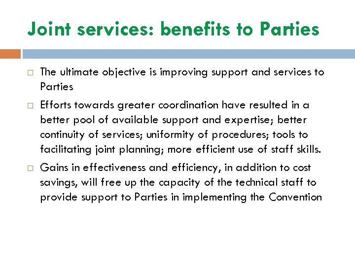 Joint services: benefits to Parties The ultimate objective is improving support and services to Parties Efforts towards greater coordination have resulted in a better pool of available support and expertise; better continuity of services; uniformity of procedures; tools to facilitating joint planning; more efficient use of staff skills. Gains in effectiveness and efficiency, in addition to cost savings, will free up the capacity of the technical staff to provide support to Parties in implementing the Convention