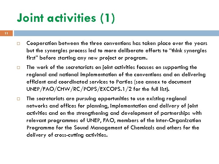 Joint activities (1) 11 Cooperation between the three conventions has taken place over the years but the synergies process led to more deliberate efforts to “think synergies first” before starting any new project or program. The work of the secretariats on joint activities focuses on supporting the regional and national implementation of the conventions and on delivering efficient and coordinated services to Parties (see annex to document UNEP/FAO/CHW/RC/POPS/EXCOPS. 1/2 for the full list). The secretariats are pursuing opportunities to use existing regional networks and offices for planning, implementation and delivery of joint activities and on the strengthening and development of partnerships with relevant programmes of UNEP, FAO, members of the Inter-Organization Programme for the Sound Management of Chemicals and others for the delivery of cross-cutting activities.