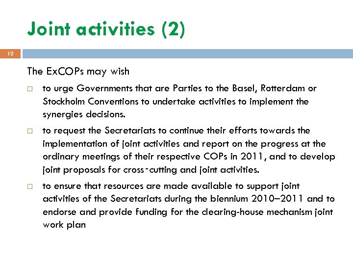 Joint activities (2) 12 The Ex. COPs may wish to urge Governments that are Parties to the Basel, Rotterdam or Stockholm Conventions to undertake activities to implement the synergies decisions. to request the Secretariats to continue their efforts towards the implementation of joint activities and report on the progress at the ordinary meetings of their respective COPs in 2011, and to develop joint proposals for cross‑cutting and joint activities. to ensure that resources are made available to support joint activities of the Secretariats during the biennium 2010– 2011 and to endorse and provide funding for the clearing-house mechanism joint work plan