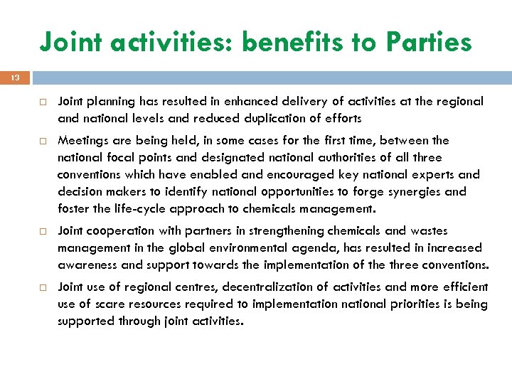 Joint activities: benefits to Parties 13 Joint planning has resulted in enhanced delivery of activities at the regional and national levels and reduced duplication of efforts Meetings are being held, in some cases for the first time, between the national focal points and designated national authorities of all three conventions which have enabled and encouraged key national experts and decision makers to identify national opportunities to forge synergies and foster the life-cycle approach to chemicals management. Joint cooperation with partners in strengthening chemicals and wastes management in the global environmental agenda, has resulted in increased awareness and support towards the implementation of the three conventions. Joint use of regional centres, decentralization of activities and more efficient use of scare resources required to implementation national priorities is being supported through joint activities.