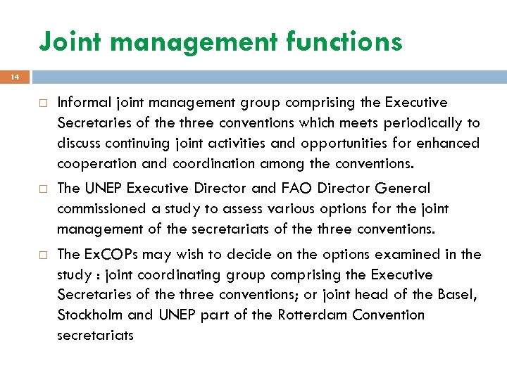 Joint management functions 14 Informal joint management group comprising the Executive Secretaries of the three conventions which meets periodically to discuss continuing joint activities and opportunities for enhanced cooperation and coordination among the conventions. The UNEP Executive Director and FAO Director General commissioned a study to assess various options for the joint management of the secretariats of the three conventions. The Ex. COPs may wish to decide on the options examined in the study : joint coordinating group comprising the Executive Secretaries of the three conventions; or joint head of the Basel, Stockholm and UNEP part of the Rotterdam Convention secretariats