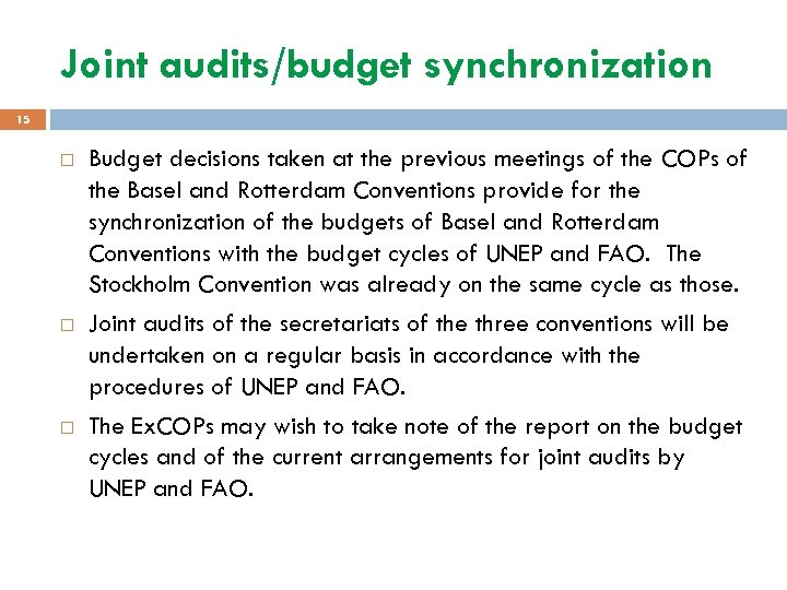 Joint audits/budget synchronization 15 Budget decisions taken at the previous meetings of the COPs of the Basel and Rotterdam Conventions provide for the synchronization of the budgets of Basel and Rotterdam Conventions with the budget cycles of UNEP and FAO. The Stockholm Convention was already on the same cycle as those. Joint audits of the secretariats of the three conventions will be undertaken on a regular basis in accordance with the procedures of UNEP and FAO. The Ex. COPs may wish to take note of the report on the budget cycles and of the current arrangements for joint audits by UNEP and FAO.