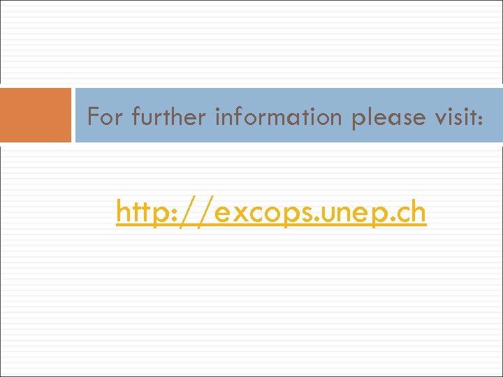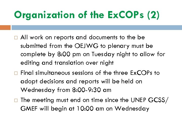 Organization of the Ex. COPs (2) All work on reports and documents to the be submitted from the OEJWG to plenary must be complete by 8: 00 pm on Tuesday night to allow for editing and translation over night Final simultaneous sessions of the three Ex. COPs to adopt decisions and reports will be held on Wednesday from 8: 00 -9: 30 am The meeting must end on time since the UNEP GCSS/ GMEF will begin at 10: 00 am on Wednesday