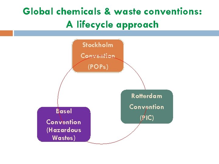 Global chemicals & waste conventions: A lifecycle approach Stockholm Convention (POPs) Rotterdam Basel Convention (Hazardous Wastes) Convention (PIC) 2