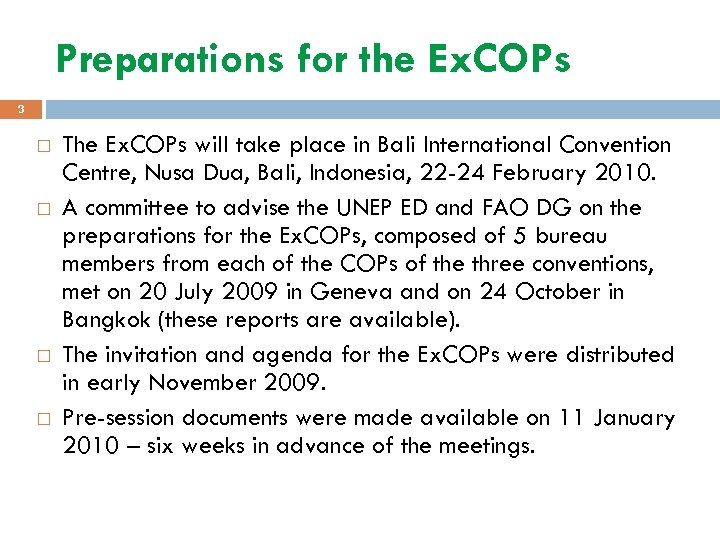 Preparations for the Ex. COPs 3 The Ex. COPs will take place in Bali International Convention Centre, Nusa Dua, Bali, Indonesia, 22 -24 February 2010. A committee to advise the UNEP ED and FAO DG on the preparations for the Ex. COPs, composed of 5 bureau members from each of the COPs of the three conventions, met on 20 July 2009 in Geneva and on 24 October in Bangkok (these reports are available). The invitation and agenda for the Ex. COPs were distributed in early November 2009. Pre-session documents were made available on 11 January 2010 – six weeks in advance of the meetings.