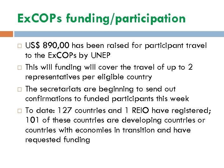 Ex. COPs funding/participation US$ 890, 00 has been raised for participant travel to the Ex. COPs by UNEP This will funding will cover the travel of up to 2 representatives per eligible country The secretariats are beginning to send out confirmations to funded participants this week To date: 127 countries and 1 REIO have registered; 101 of these countries are developing countries or countries with economies in transition and have requested funding