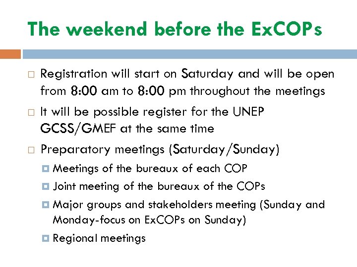 The weekend before the Ex. COPs Registration will start on Saturday and will be open from 8: 00 am to 8: 00 pm throughout the meetings It will be possible register for the UNEP GCSS/GMEF at the same time Preparatory meetings (Saturday/Sunday) Meetings of the bureaux of each COP Joint meeting of the bureaux of the COPs Major groups and stakeholders meeting (Sunday and Monday-focus on Ex. COPs on Sunday) Regional meetings