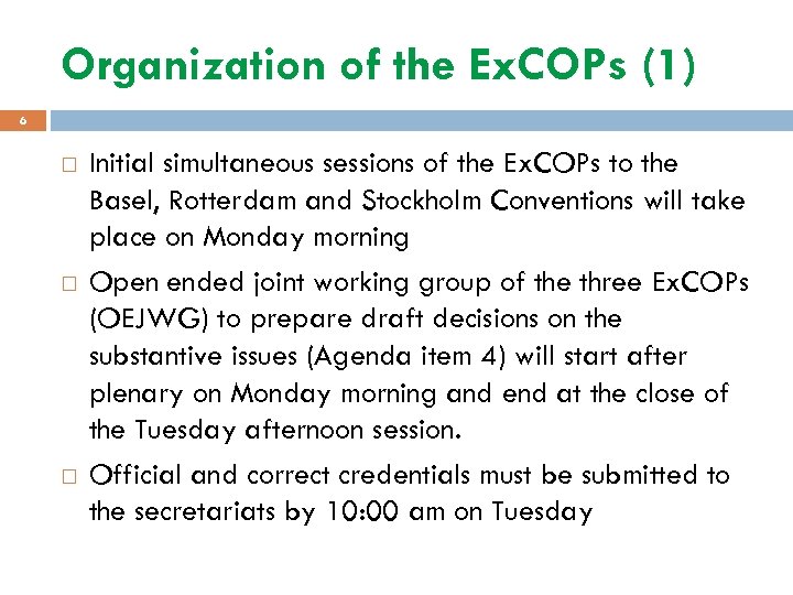 Organization of the Ex. COPs (1) 6 Initial simultaneous sessions of the Ex. COPs to the Basel, Rotterdam and Stockholm Conventions will take place on Monday morning Open ended joint working group of the three Ex. COPs (OEJWG) to prepare draft decisions on the substantive issues (Agenda item 4) will start after plenary on Monday morning and end at the close of the Tuesday afternoon session. Official and correct credentials must be submitted to the secretariats by 10: 00 am on Tuesday