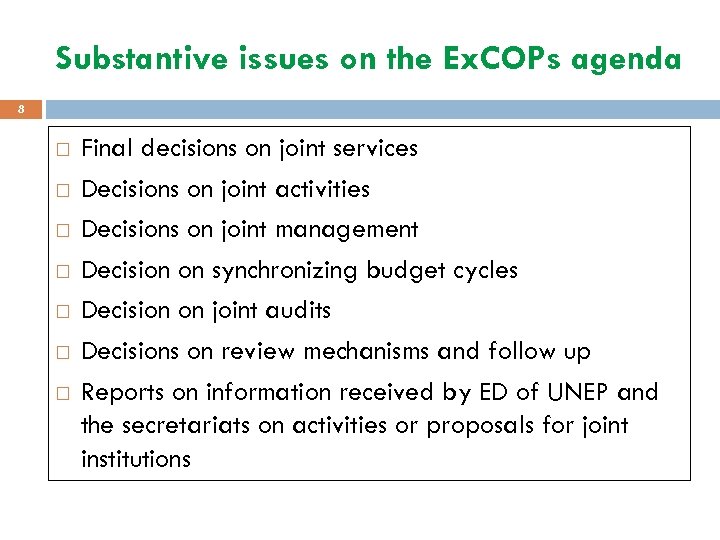 Substantive issues on the Ex. COPs agenda 8 Final decisions on joint services Decisions on joint activities Decisions on joint management Decision on synchronizing budget cycles Decision on joint audits Decisions on review mechanisms and follow up Reports on information received by ED of UNEP and the secretariats on activities or proposals for joint institutions