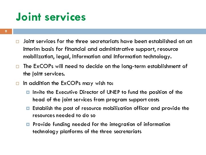 Joint services 9 Joint services for the three secretariats have been established on an interim basis for financial and administrative support, resource mobilization, legal, information and information technology. The Ex. COPs will need to decide on the long-term establishment of the joint services. In addition the Ex. COPs may wish to: Invite the Executive Director of UNEP to fund the position of the head of the joint services from program support costs Establish the post of resource mobilization officer and provide the resources needed to do so Provide funding needed for the integration of information technology platforms of the three secretariats