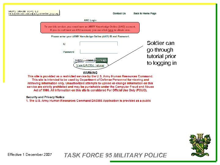Soldier can go through tutorial prior to logging in Effective 1 December 2007 TASK FORCE 95 MILITARY POLICE