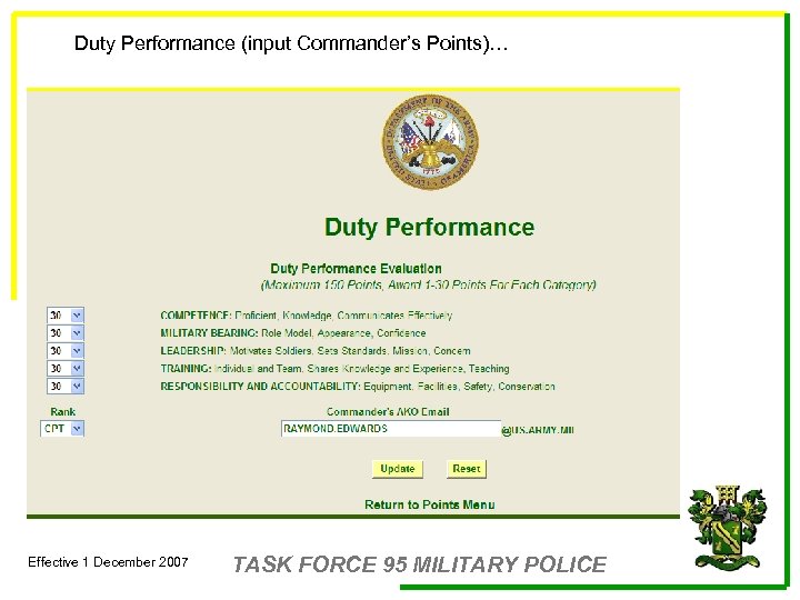 Duty Performance (input Commander’s Points)… Effective 1 December 2007 TASK FORCE 95 MILITARY POLICE