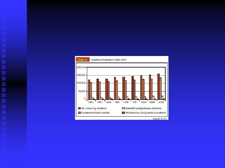 Poland – the upsurge in the number of students is foremost related to the increase in the number of evening and weekend students. Larger number of high school graduates continue their education in HE sector – in 1990 13% and in 2001 44%. Progression from stage of «elite» to «mass» stage. The key challenge for the begenning of 21 st century will be to upkeep the dynamic growth, and a constant quality improvement of HE system.