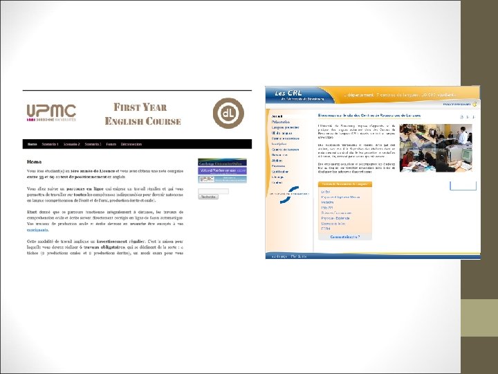 Accompagnement Ud. S • un parcours construit par l’étudiant ; • un accompagnement par les enseignants ; • des feuilles de suivi au CRL; • des activités individuelles, en groupes, à distance (tandem), • des ateliers de conversation (5 -6 étudiants. ) UPMC • Confronter les apprenants à leurs besoins langagiers ; • Les rétroactions correctives seraient un moyen efficace pour conduire l’apprenant à repérer (Rutherford, 1987) et à aller vers plus d’acquisition en LE ; • Interactions asynchrones : - Plus de temps ; - Structuration et ajustement des données langagières ; - Progression potentielle dans l’interlangue (Gass et Varonis, 1994).