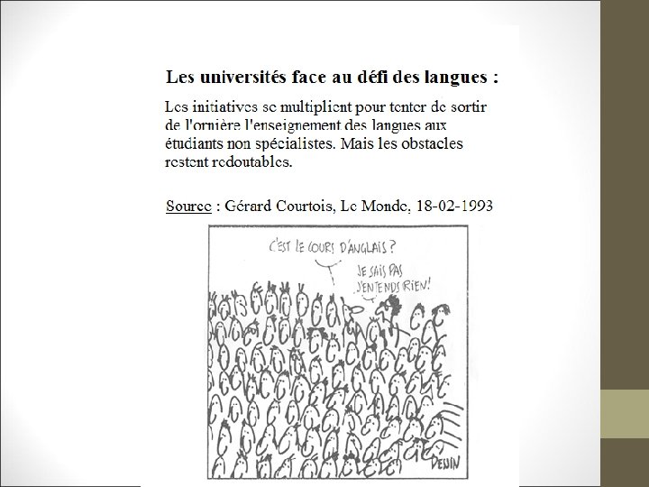 Contexte • • - Contexte social Université française : courant de transformations nécessaires Massification, hétérogénéité et mobilité ; TIC et potentiel de ressources et d’activités ; Apprentissage tout au long de la vie Þ « Faire passer un message positif : les Français sont tout à fait capables de parler plusieurs langues » (Rapport Halimi, janvier 2012).