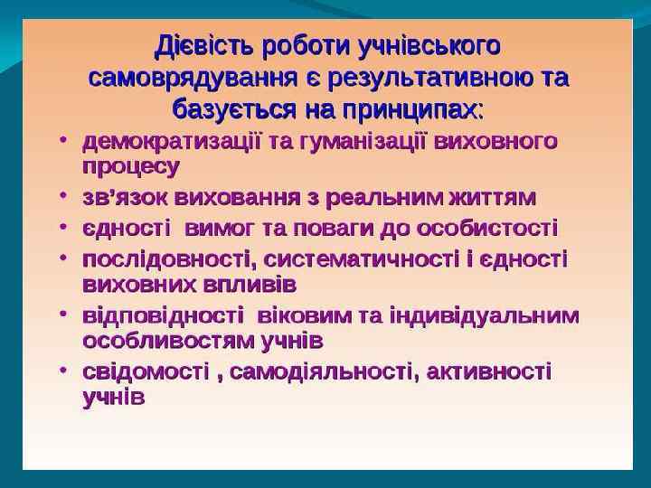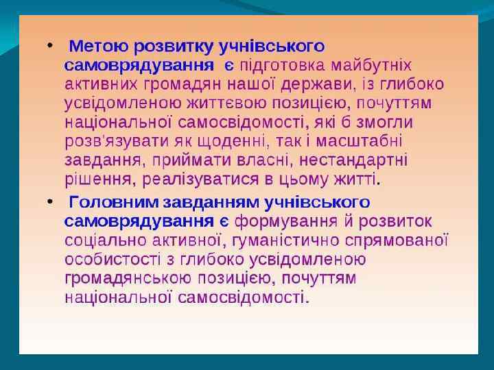 Президент школи Краснонога Альона Олександрівна (учениця 9 -Б класу) · Виносить на розгляд парламенту питання, що турбують учнів школи; · Має право брати участь у роботі педагогічних рад; · Має право ініціювати зміни, що покращать навчання та дозвілля учнів; · Не має права передавати свої повноваження іншим особам; · Координує діяльність студій; · Має право «вето» щодо рішень парламенту; · Рішення президента школи незалежні від рішень адміністрації школи з питань учнівського самоврядування.