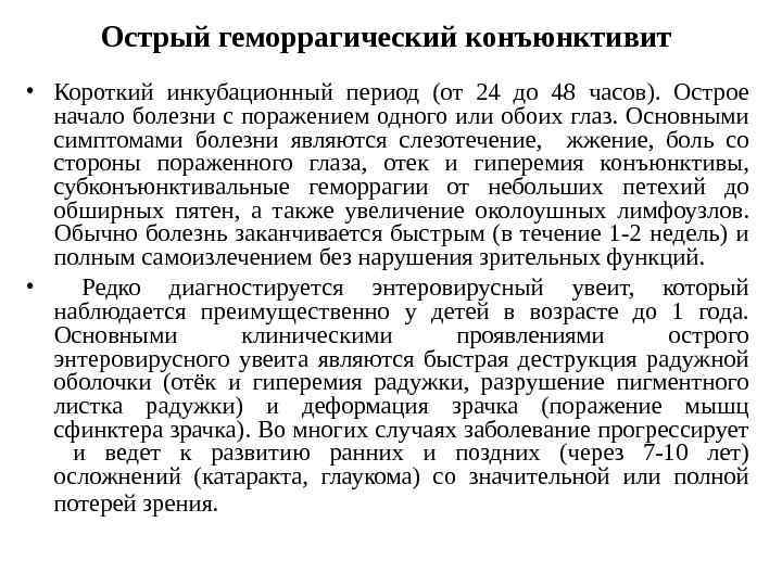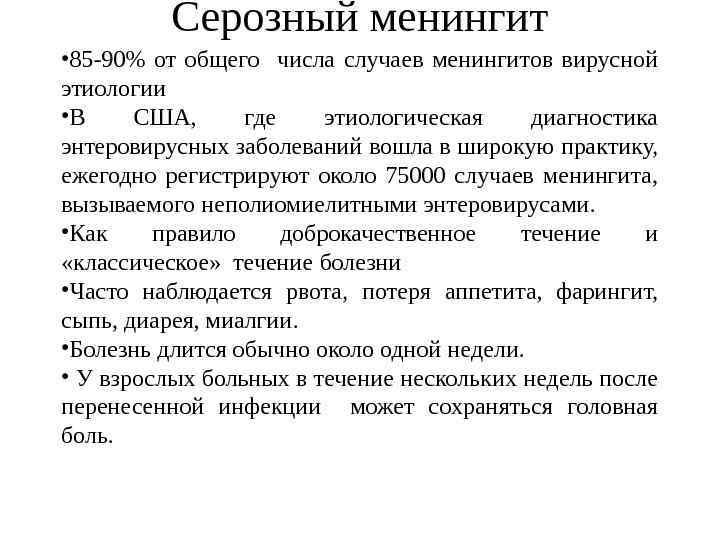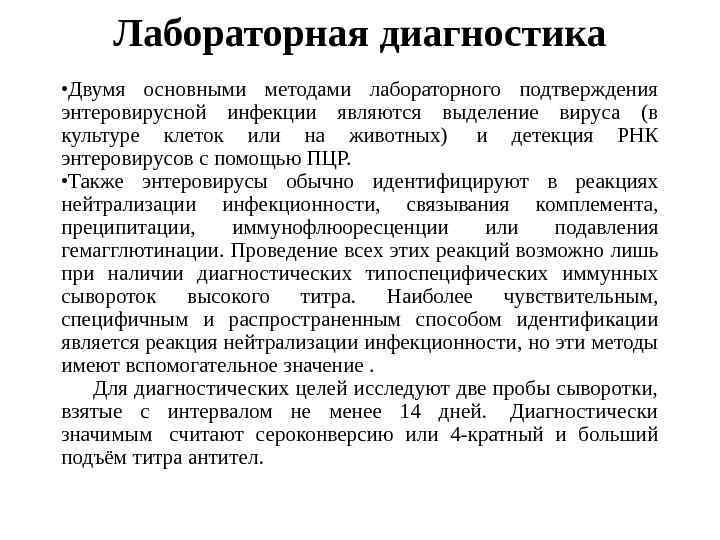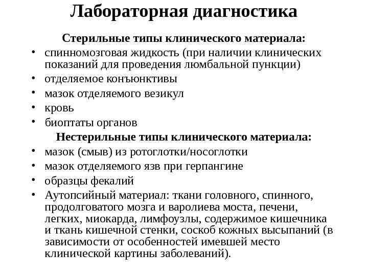 Особенности клинических проявлений Сходные клинические проявления могут быть связаны с различными серотипами энтеровирусов , в то же время, представители одного и того же серотипа могут вызывать различные клинические формы заболевания. Лишь для некоторых серотипов энтеровирусов характерен определенный, строго очерченный комплекс клинических симптомов, который присущ именно этим возбудителям и не наблюдается при инфицировании другими серотипами. Развитие конкретного синдрома зависит как от свойств возбудителя, так и от состояния макроорганизма в момент инфицирования.