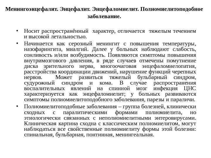 Особенности клинических проявлений Более 90% инфекций, вызванных вирусом полиомиелита, и более 50% остальных энтеровирусных инфекций протекают стерто. Если симптомы появляются, то они чаще неспецифичны — лихорадка, воспаление верхних дыхательных путей. Характерная клиническая картина развивается лишь в небольшой части случаев (в последнее время чаще).