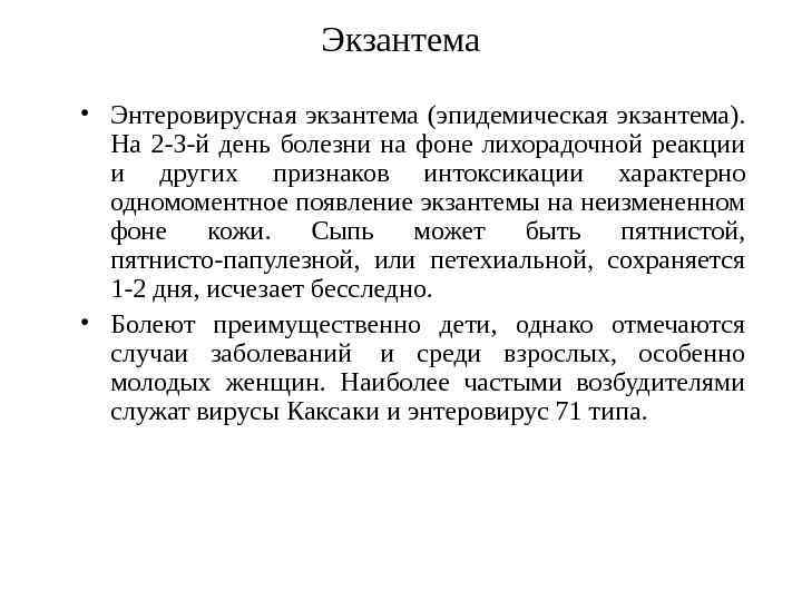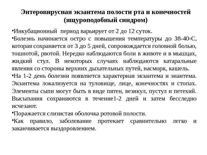 Энтеровирусная лихорадка (малая болезнь) – острая лихорадочная кратковременная болезнь без каких либо специфических симптомов. Данная клиническая форма по частоте распространения занимает первое место среди других клинических синдромов, вызываемых энтеровирусами. Диагностировать эту форму только по клиническим данным не представляется возможным. • Заболевание обычно начинается остро, наблюдается озноб, головная боль, температура тела повышается до 38 -39 о С, нередки тошнота и рвота. Температура обычно держится 1 -3 дня, после чего наступает выздоровление.