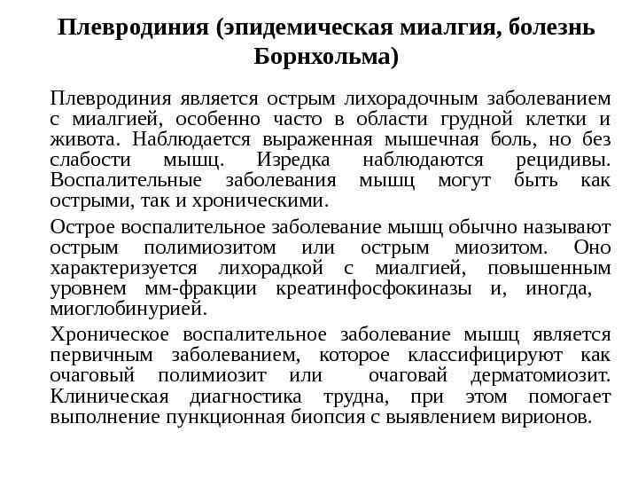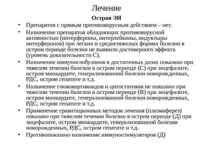 Клинические синдромы, наблюдающиеся при энтеровирусных инфекциях неполиомиелитной этиологии Вирусы Коксаки В • Плевродиния • Серозный менингит, менингоэнцефалит • Параличи (редкие случаи) • Тяжёлая системная инфекция новорожденных • Миокардит • Заболевание верхних дыхательных путей • Экзантема • Гепатит • Лихорадка