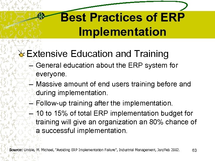 Best Practices of ERP Implementation Change Management – Changes in business procedures, responsibilities, work load. 1 – As a result, ERP implementations are times of high stress, long hours, and uncertainty. 1 – Mid-level managers must 2 • facilitate continual feedback from employees, • provide honest answers to their questions, and • help resolve their problems. Sources: 1. Yakovlev, I. V. , “An ERP Implementation and Business Process Reengineering at a Small University”, Educause Quarterly, Number 2, 2002; 2. Umble, M. Michael, “Avoiding ERP Implementation Failure”, Industrial Management, Jan/Feb 2002. 62