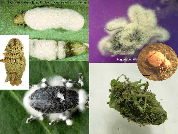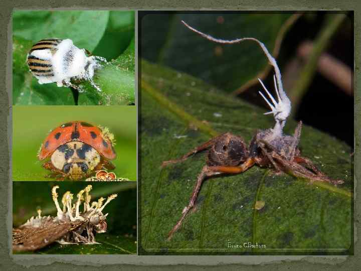 В частности: Гриб Beauveria bassiana поражает жуков, куколок и личинок большого елового лубоеда; Виды Cephalosporium и Verticilun приводят к гибели соснового пилильщика; Грибы рода Pythium паразитируют на личинках 7 видов комаров; Entomophthora sphaerosperma вызывает болезнь гусениц капустной белянки; Гриб Empusa (Etomophthora) muscae был обнаружен на луковой мухе….