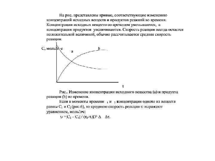 Скорость химической реакции - изменение концентрации одного из исходных веществ или конечных продуктов в единицу времени. Скорость гомогенной и скорость гетерогенной реакции определяются различно: - для гомогенной реакции скорость рассчитывается через количество вещества, вступившего в реакцию или образовавшегося при реакции в единицу времени в единице объема: рассчитывается =dc/d и измеряется в моль л∙с. - для гетерогенной реакции скорость рассчитывается по выражению = dc/S∙d и измеряется в моль м 2∙с. Скорость реакции может быть измерена также по изменению объема выделяющегося газа, изменению количества образующегося осадка, вязкости раствора, его оптической плотности, р. Н раствора, электропроводности и др.