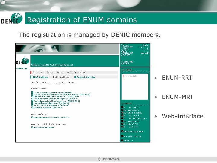 Registration of ENUM domains The registration is managed by DENIC members. • ENUM-RRI • ENUM-MRI • Web-Interface © DENIC e. G