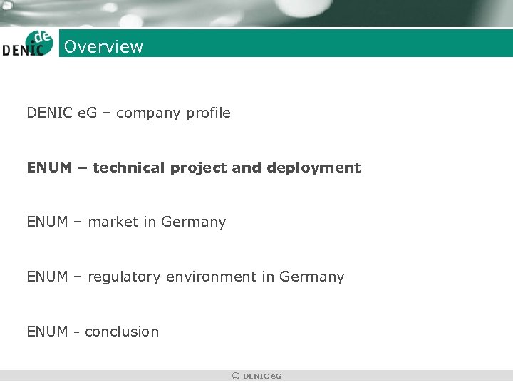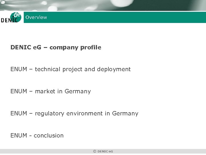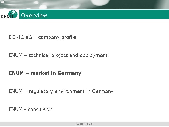 Overview DENIC e. G – company profile ENUM – technical project and deployment ENUM – market in Germany ENUM – regulatory environment in Germany ENUM - conclusion © DENIC e. G