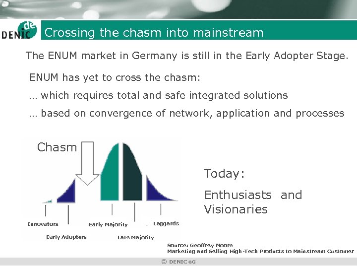 Crossing the chasm into mainstream The ENUM market in Germany is still in the Early Adopter Stage. ENUM has yet to cross the chasm: … which requires total and safe integrated solutions … based on convergence of network, application and processes Chasm Today: Enthusiasts and Visionaries Innovators Early Adopters Early Majority Laggards Late Majority Source: Geoffrey Moore Marketing and Selling High-Tech Products to Mainstream Customer © DENIC e. G