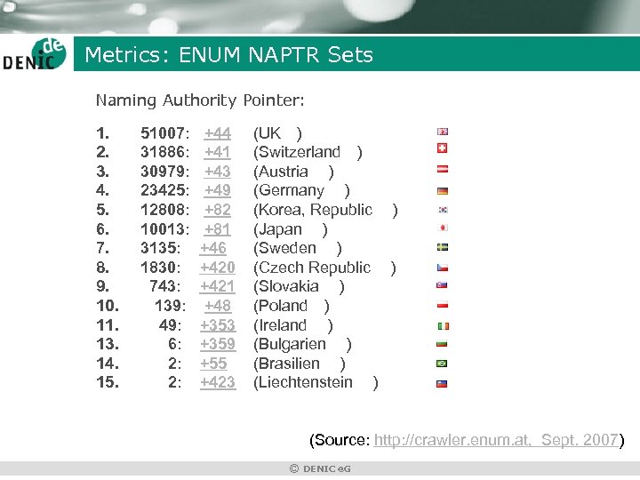Metrics: ENUM NAPTR Sets Naming Authority Pointer: 1. 2. 3. 4. 5. 6. 7. 8. 9. 10. 11. 13. 14. 15. 51007: 31886: 30979: 23425: 12808: 10013: 3135: 1830: 743: 139: 49: 6: 2: 2: +44 (UK ) +41 (Switzerland ) +43 (Austria ) +49 (Germany ) +82 (Korea, Republic ) +81 (Japan ) +46 (Sweden ) +420 (Czech Republic ) +421 (Slovakia ) +48 (Poland ) +353 (Ireland ) +359 (Bulgarien ) +55 (Brasilien ) +423 (Liechtenstein ) (Source: http: //crawler. enum. at, Sept. 2007) © DENIC e. G