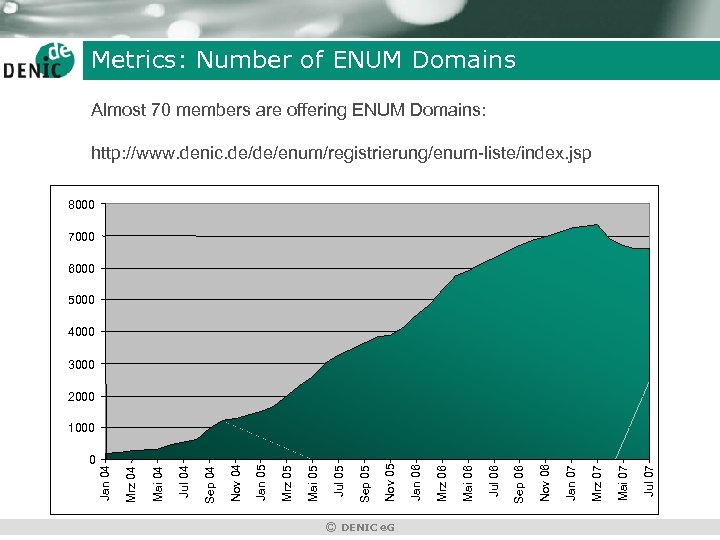 Metrics: Number of ENUM Domains Almost 70 members are offering ENUM Domains: http: //www. denic. de/de/enum/registrierung/enum-liste/index. jsp 8000 7000 6000 5000 4000 3000 2000 © DENIC e. G Jul 07 Mai 07 Mrz 07 Jan 07 Nov 06 Sep 06 Jul 06 Mai 06 Mrz 06 Jan 06 Nov 05 Sep 05 Jul 05 Mai 05 Mrz 05 Jan 05 Nov 04 Sep 04 Jul 04 Mai 04 Mrz 04 0 Jan 04 1000