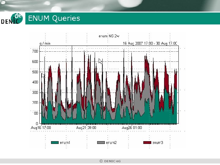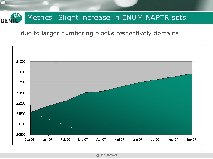 Metrics: Slight increase in ENUM NAPTR sets … due to larger numbering blocks respectively domains Domains 24000 23500 23000 22500 22000 21500 21000 20500 Dez 06 Jan 07 Feb 07 Mrz 07 Apr 07 Mai 07 © DENIC e. G Jun 07 Jul 07 Aug 07 Sep 07