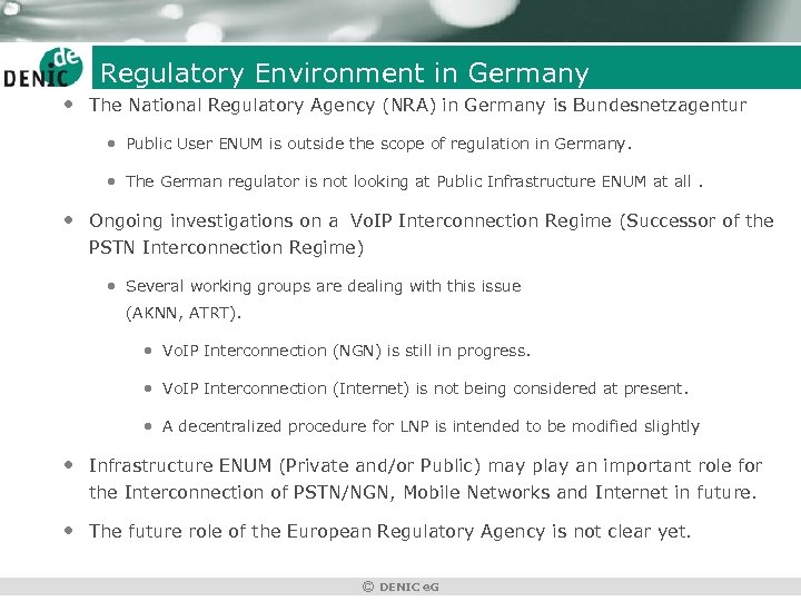 Regulatory Environment in Germany • The National Regulatory Agency (NRA) in Germany is Bundesnetzagentur • Public User ENUM is outside the scope of regulation in Germany. • The German regulator is not looking at Public Infrastructure ENUM at all. • Ongoing investigations on a Vo. IP Interconnection Regime (Successor of the PSTN Interconnection Regime) • Several working groups are dealing with this issue (AKNN, ATRT). • Vo. IP Interconnection (NGN) is still in progress. • Vo. IP Interconnection (Internet) is not being considered at present. • A decentralized procedure for LNP is intended to be modified slightly • Infrastructure ENUM (Private and/or Public) may play an important role for the Interconnection of PSTN/NGN, Mobile Networks and Internet in future. • The future role of the European Regulatory Agency is not clear yet. © DENIC e. G