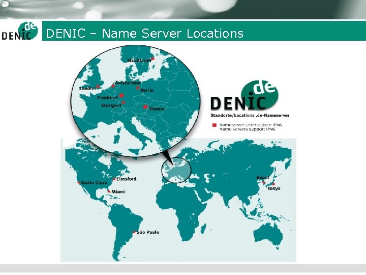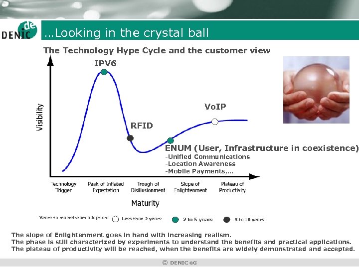 …Looking in the crystal ball The Technology Hype Cycle and the customer view IPV 6 Vo. IP RFID ENUM (User, Infrastructure in coexistence) -Unified Communications -Location Awareness -Mobile Payments, … Years to mainstream adoption: Less than 2 years 2 to 5 years 5 to 10 years The slope of Enlightenment goes in hand with increasing realism. The phase is still characterized by experiments to understand the benefits and practical applications. The plateau of productivity will be reached, when the benefits are widely demonstrated and accepted. © DENIC e. G