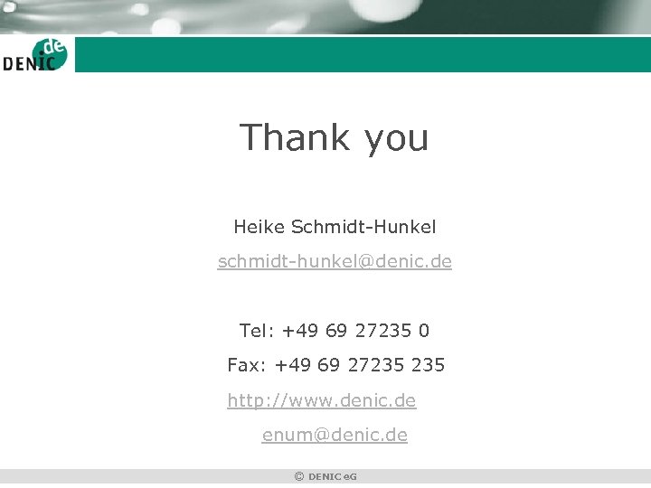 Thank you Heike Schmidt-Hunkel schmidt-hunkel@denic. de Tel: +49 69 27235 0 Fax: +49 69 27235 http: //www. denic. de enum@denic. de © DENIC e. G