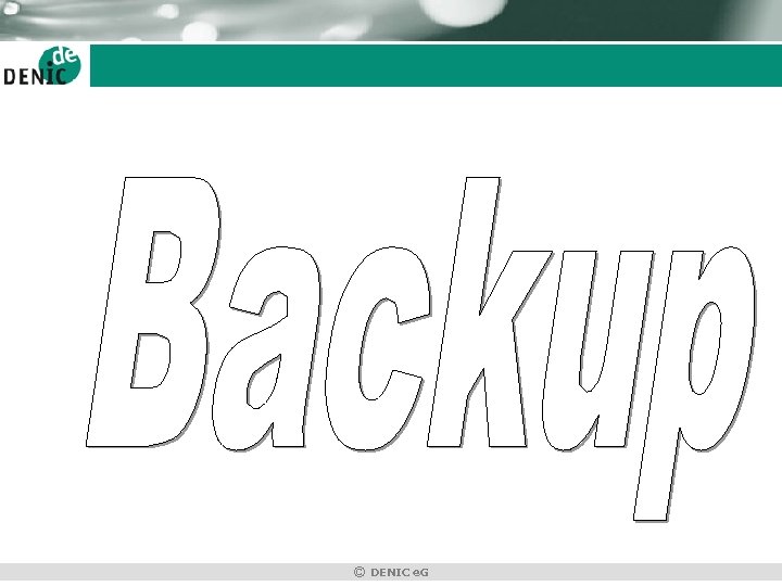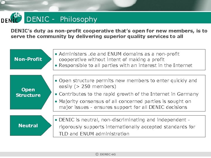 DENIC - Philosophy DENIC’s duty as non-profit cooperative that’s open for new members, is to serve the community by delivering superior quality services to all Non-Profit Open Structure • Administers. de and ENUM domains as a non-profit cooperative without intent of making a profit • Responsible to all parties with an interest in the Internet • Open structure permits new members to enter quickly and easily (> 250 members) • Contributes to the rapid growth of the Internet in Germany • Majority consensus of all concerned parties is sought on major issues - ensures support for all DENIC decisions Neutral • DENIC is neutral, non-discriminating and independent rigorously supports internationally accepted standards for TLD and ENUM administration © DENIC e. G