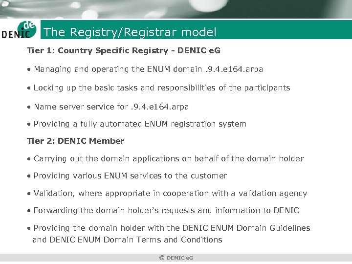 The Registry/Registrar model Tier 1: Country Specific Registry - DENIC e. G • Managing and operating the ENUM domain. 9. 4. e 164. arpa • Locking up the basic tasks and responsibilities of the participants • Name server service for. 9. 4. e 164. arpa • Providing a fully automated ENUM registration system Tier 2: DENIC Member • Carrying out the domain applications on behalf of the domain holder • Providing various ENUM services to the customer • Validation, where appropriate in cooperation with a validation agency • Forwarding the domain holder's requests and information to DENIC • Providing the domain holder with the DENIC ENUM Domain Guidelines and DENIC ENUM Domain Terms and Conditions © DENIC e. G