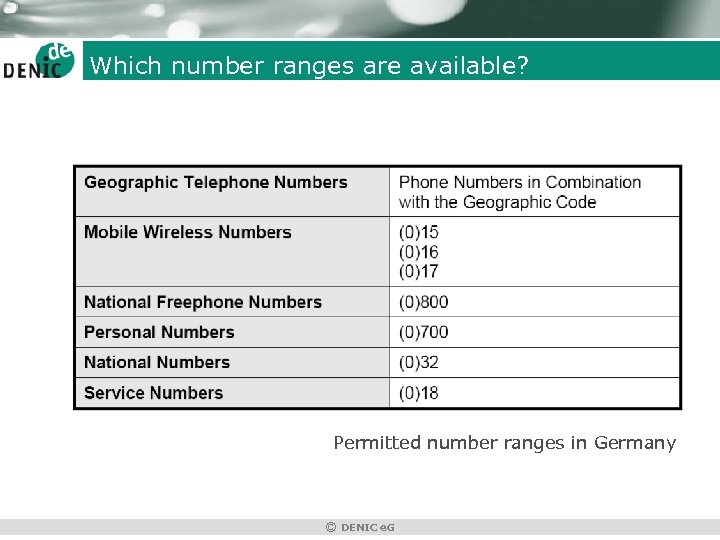 Which number ranges are available? Permitted number ranges in Germany © DENIC e. G