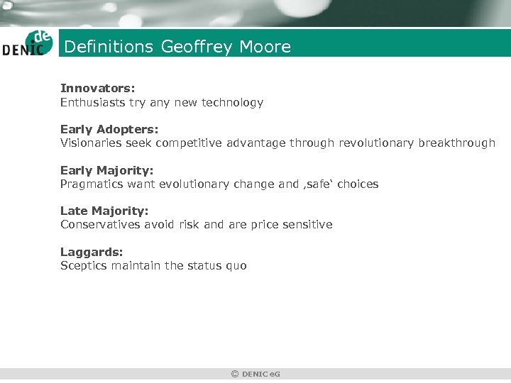 Definitions Geoffrey Moore Innovators: Enthusiasts try any new technology Early Adopters: Visionaries seek competitive advantage through revolutionary breakthrough Early Majority: Pragmatics want evolutionary change and ‚safe‘ choices Late Majority: Conservatives avoid risk and are price sensitive Laggards: Sceptics maintain the status quo © DENIC e. G