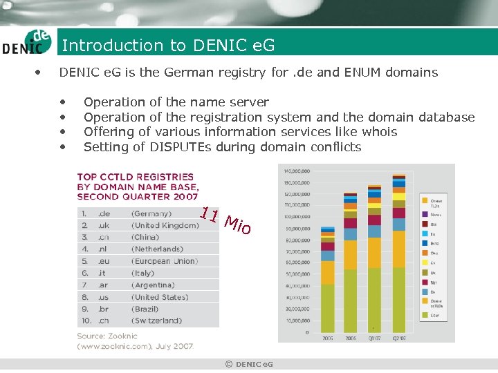 Introduction to DENIC e. G • DENIC e. G is the German registry for. de and ENUM domains • • Operation of the name server Operation of the registration system and the domain database Offering of various information services like whois Setting of DISPUTEs during domain conflicts 11 Mio © DENIC e. G