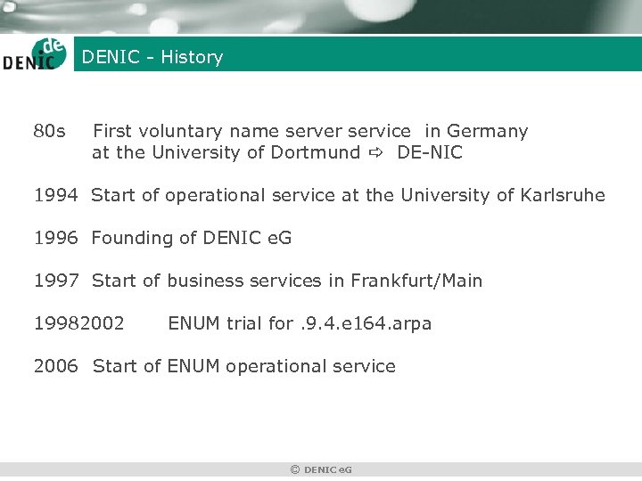 DENIC - History 80 s First voluntary name server service in Germany at the University of Dortmund DE-NIC 1994 Start of operational service at the University of Karlsruhe 1996 Founding of DENIC e. G 1997 Start of business services in Frankfurt/Main 19982002 ENUM trial for. 9. 4. e 164. arpa 2006 Start of ENUM operational service © DENIC e. G