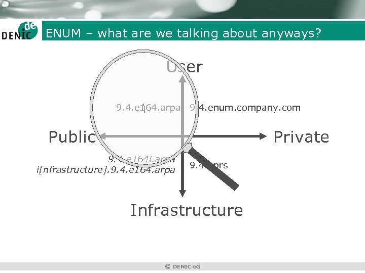 ENUM – what are we talking about anyways? User 9. 4. e 164. arpa 9. 4. enum. company. com Public Private 9. 4. e 164 i. arpa i[nfrastructure]. 9. 4. e 164. arpa 9. 4. gprs Infrastructure © DENIC e. G