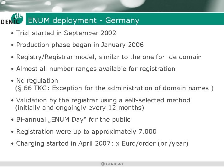 ENUM deployment - Germany • Trial started in September 2002 • Production phase began in January 2006 • Registry/Registrar model, similar to the one for. de domain • Almost all number ranges available for registration • No regulation (§ 66 TKG: Exception for the administration of domain names ) • Validation by the registrar using a self-selected method (initially and ongoingly every 12 months) • Bi-annual „ENUM Day“ for the public • Registration were up to approximately 7. 000 • Charging started in April 2007: x Euro/order (or /year) © DENIC e. G